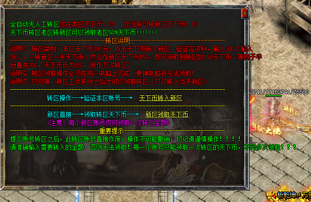 问:我要转区,要怎么操作?答:转区举例:本区天下币300个,点击天下币转入新区,验证完资料,输入300(输入多少,新区只能领取一半天下币)